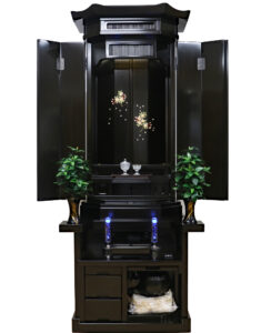 動画でご紹介した「厨子型1337番」は、黒檀シートの荘厳な佇まいに、桜の蒔絵がくっきりと配置された美しい厨子型仏壇です。新しい新型のリモコンへの交換、そして内側と外側に計2本のLED照明が取り付けられており、特装御本尊様がゆったりとご安置いただけます。